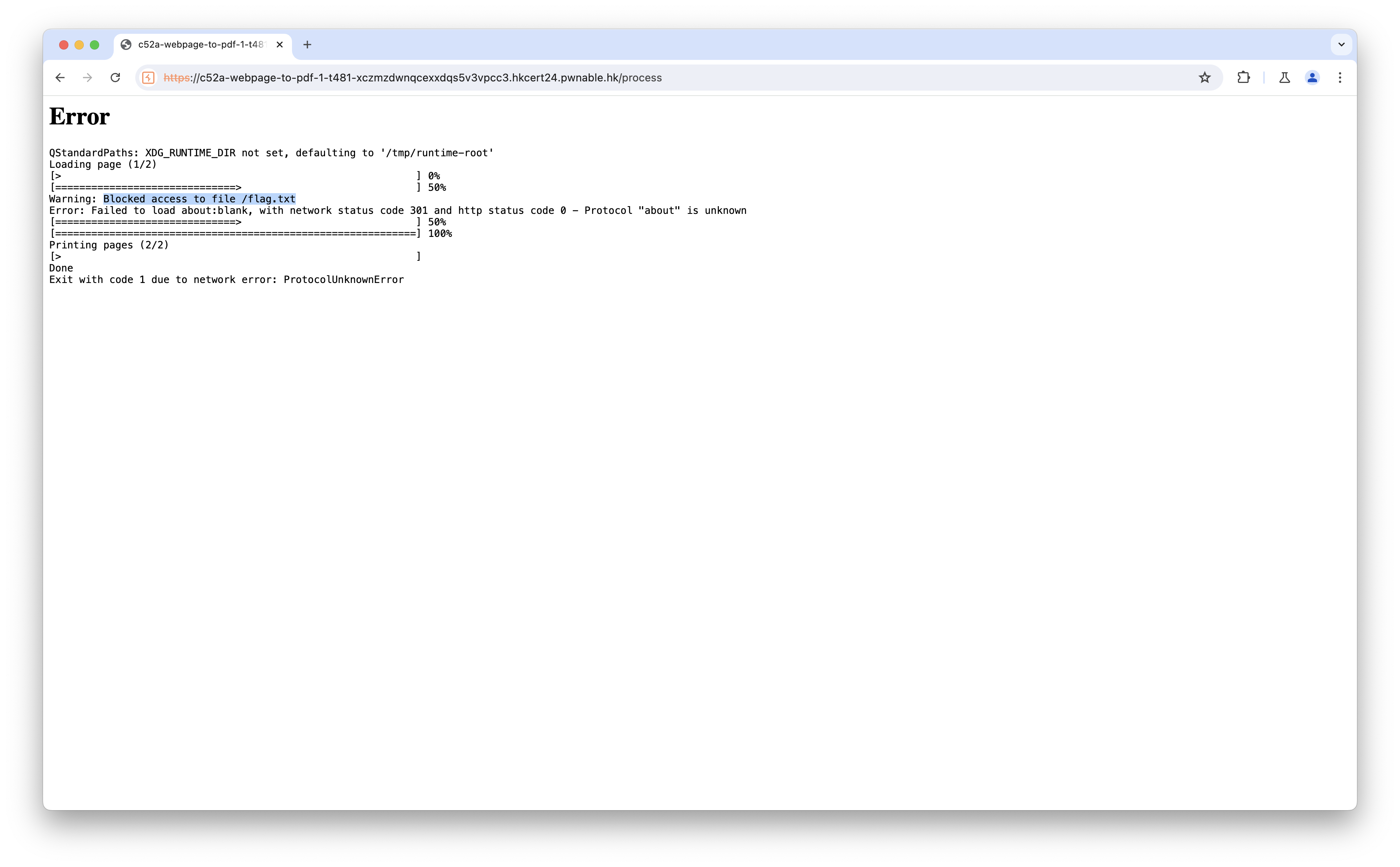 <iframe src="file:///flag.txt" width="100%" height="100%"></iframe>我们可以发现网站报错 Blocked access to file /flag.txt